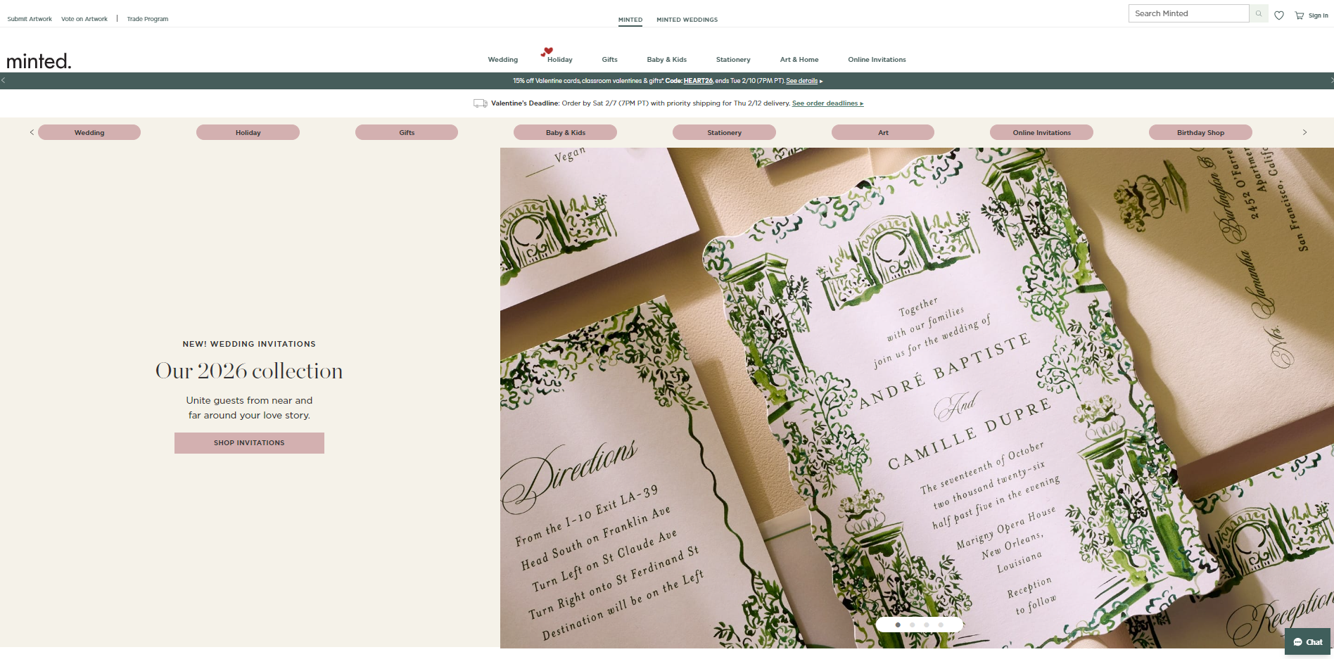 Minted is known for its artisanal and independent artist-made designs. While the main operations have to do with printed cards, they also offer high-quality online invitations.