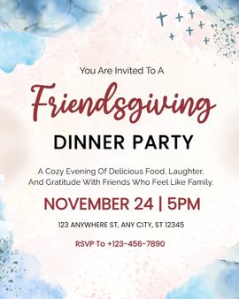 Friendsgiving is more casual and collaborative. Invitations usually focus on togetherness, shared meals, and relaxed timing, rather than formal hosting rules.