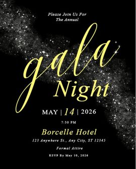 A complete gala invitation includes the event name, date, time, venue address, dress code, and host or organization details. Add parking, valet, or security notes if needed.